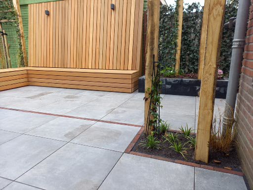 Doordat de gehele bank blind is geschroefd zijn er geen schroeven zichtbaar. Bij deze bank hebben we gekozen voor een extra hoge rugleuning waardoor een groot deel van de achterliggende garagemuur gecamoufleerd word wat de wens is.